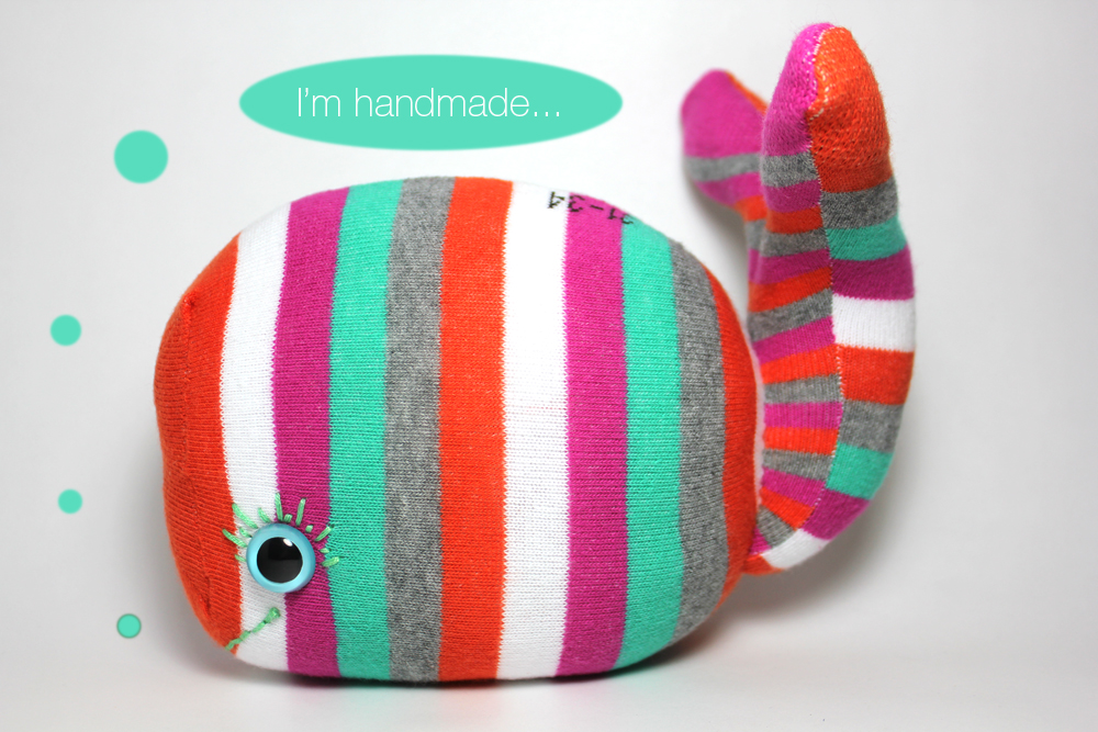So after viewing the invitation, googling images of real and make believe Whales, I set about working out how to turn a pair (or more) socks into a happy, friendly little Whale friend. I knew it couldn’t look like a fish….and I didn’t want it to be too simple either. And you’d be surprised how different she looks, when the eyes are placed in different locations! So here is the end result! My friend fell in love with her instantly, which I’m so happy about and I can only hope this special little girl, who isn’t too far away from this world loves her too.