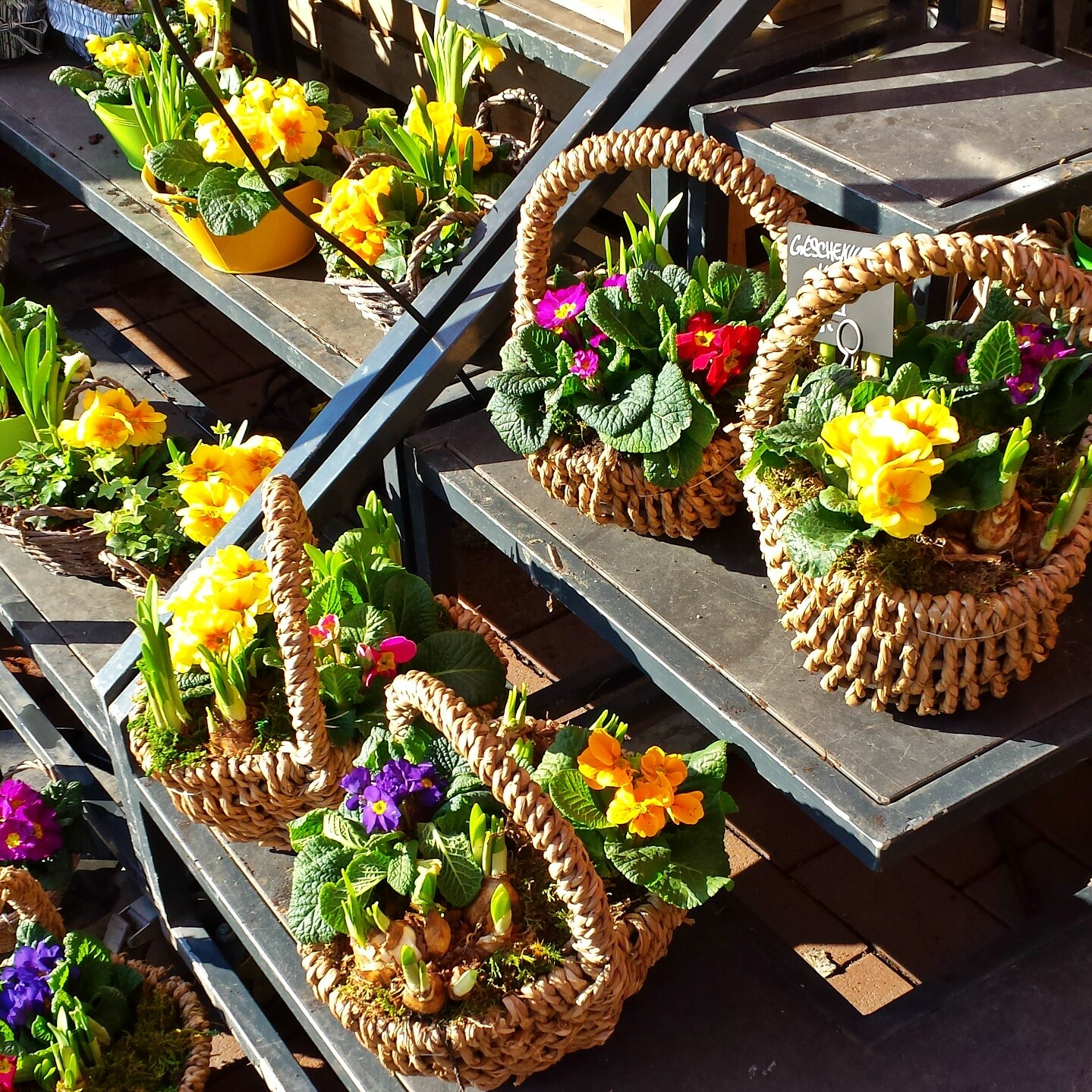 Spring flowers in baskets make me smile.